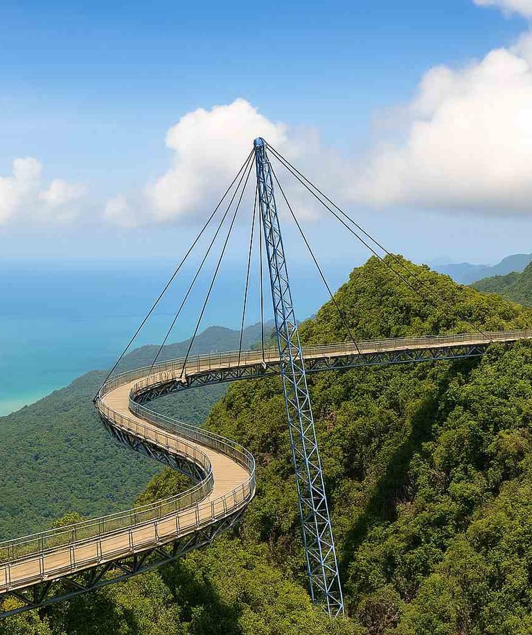 Langkawi Sky Bridge. Подъём проходит над тропическими лесами и горами, а с вершины открываются захватывающие виды на архипелаг и Андаманское море. В ясную погоду можно увидеть даже побережье Таиланда.