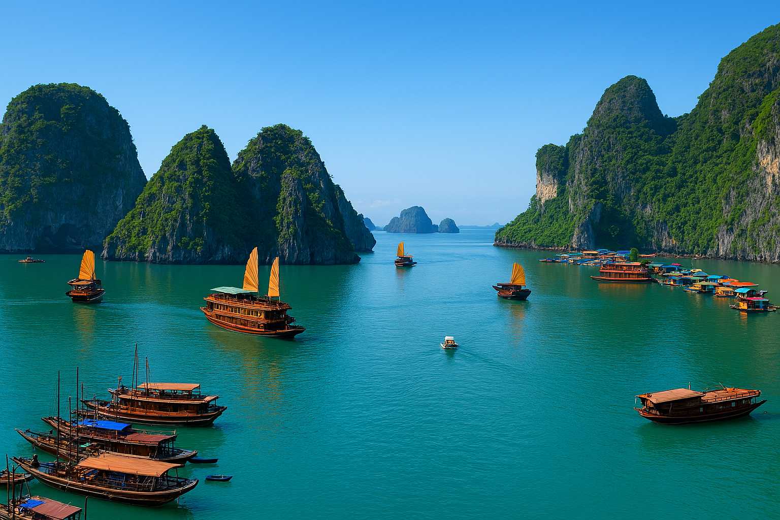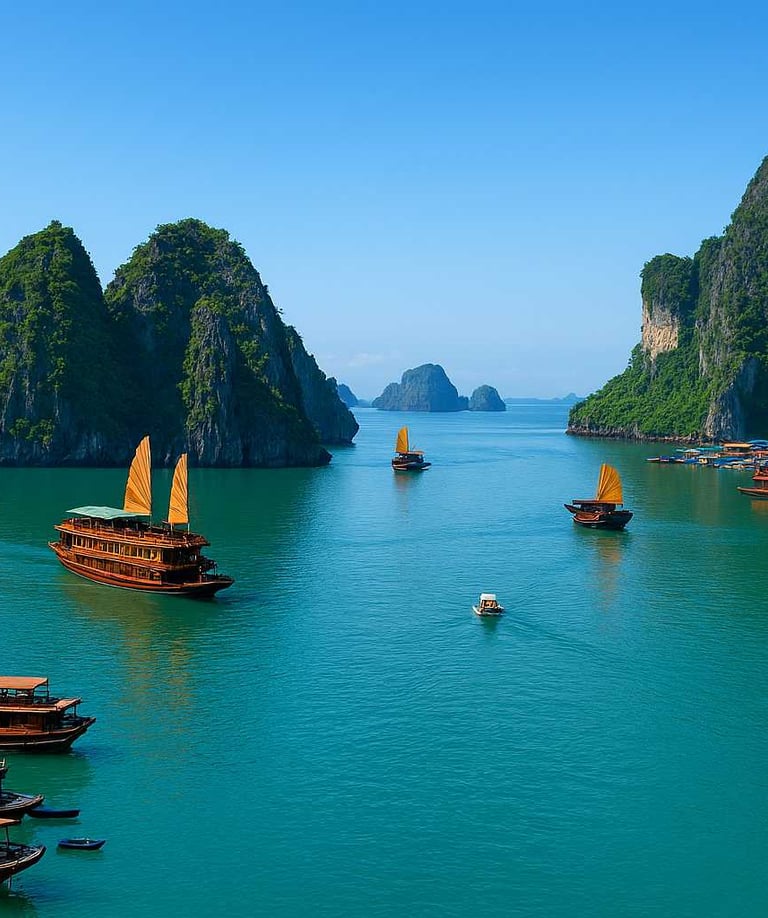 Бухта Халонг - однодневные или многодневные круизы среди известняковых островов и изумрудной воды. Можно отправиться на катамаране, насладиться морской прогулкой, купанием и свежими морепродуктами на борту.